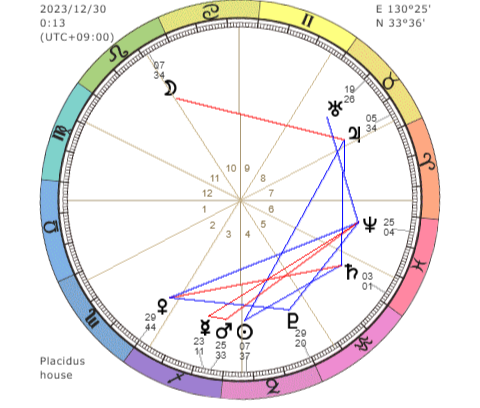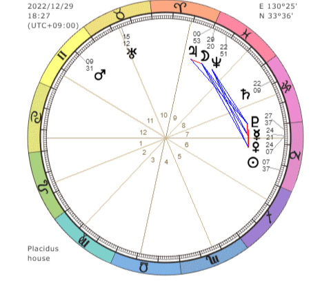 アスペクトは水星と金星と冥王星がゆるくセクスタイル(60度)、木星がほぼぴったりコンジャンクション(0度)。